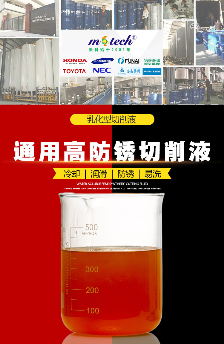 东莞美科通用防锈型乳化切削液,具有优秀的润滑性能,防锈性能和冷却性能。废屑沉淀快,含有特效防氧化成份,可有效杜绝铜合金和铝合金工件在加工后出现白斑或发黑等氧化变色现象,适用于有色金属、钢铁、铝合金、铜合金、不锈钢、合金钢、铸铁、高碳钢等材料的切削、磨削、钻孔、冲压等金属加工方式。【美科切削液全国招商火热进行中,诚邀您的加盟!全国免费咨询热线400-8898-938】
