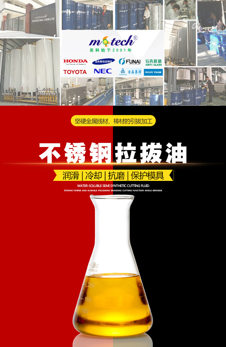 东莞美科不锈钢拉拔油,主要用于不锈钢或坚硬金属线材、棒材的引拔加工,具有特佳散热和抗磨损效果,降低模具磨损,可有效延长模具使用寿命,节约生产加工成本。